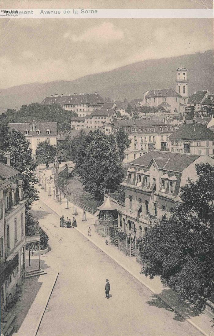 Avenue de la Sorne, vue de haut, rivière, kiosque, café Transit, arbres, église