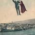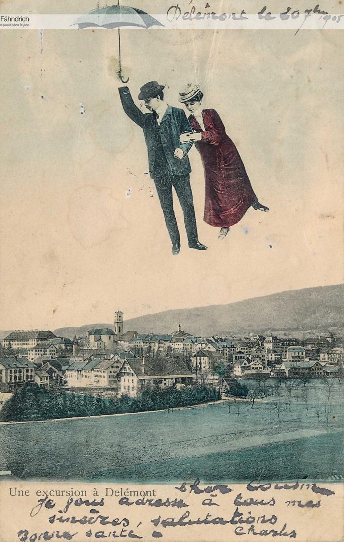 Vue générale, dessin, couleurs, Homme et femmes volent avec parapluie