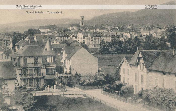 Vue générale, église, château, carrefour, quartier de la Turquie, sapins, balcons, jardins