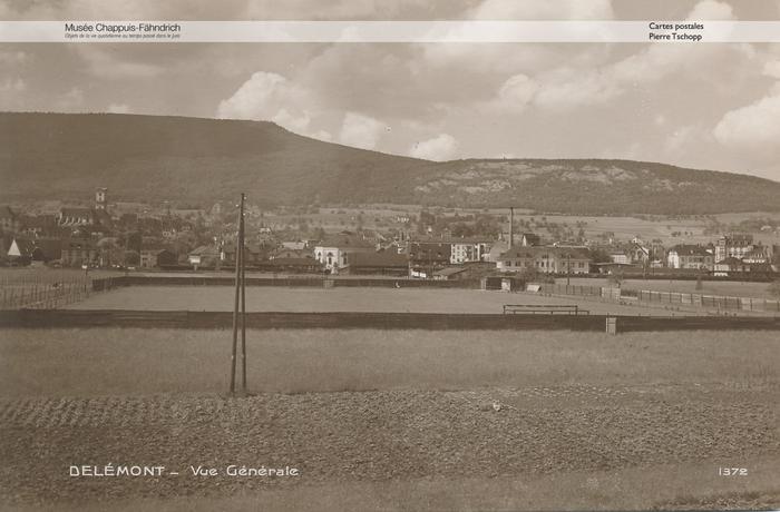 Vue générale, terrains de foot, église, montagnes, cheminée industrielle, but