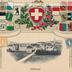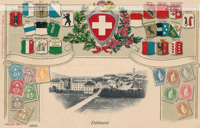 Décorations, couleurs, timbres, cantons, écusson suisse, cor, sapins, église, château