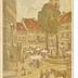 Marché, Hôtel de ville, clocher, dessin, fontaine, cheval, vendeurs, escalliers, chien
